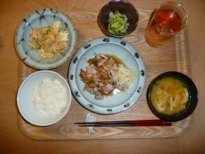 蒸し鶏のラッキョソースがけ、煎り豆腐、きゅうりと白菜の酢の物、揚げとかぼちゃの味噌汁 蒸し鶏にかかったラッキョソースがなんともいえず美味しかったです。またきゅうりの酢の物もこの時期には嬉しい一品でした。