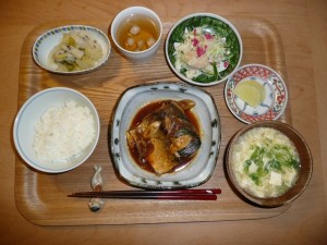 さばの味噌煮、大根ときゅうりと帆立の酢の物、はんぺんと白菜の煮物、豆腐と玉子のお吸い物 さばにお味噌がよくしみ込んでいてとても美味しかったです。酢の物は大根・きゅうりとも歯応えがよく食べ応えがありました。