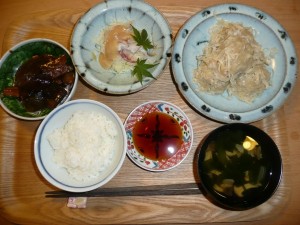 菊花しゅうまい、鯛の酢味噌がけ、なすの味噌煮、きのことわかめのお吸い物 しゅうまいは中に豆腐が入っていて軟らかくて美味しかったです。鯛の酢味噌がけもみょうが入りで複雑な味が楽しめました
