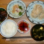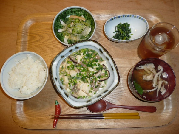 マーボー豆腐、きゅうりともやしと揚げの酢の物、ほうれん草のゴマ和え、鯛のあらのお吸い物、 鯛のあらのおすいものが絶妙に美味しかった。あらは顔の部分を頂いたのでコラーゲンたっぷりでした。きっと明日の朝はお顔がプリンプリンのはずです。