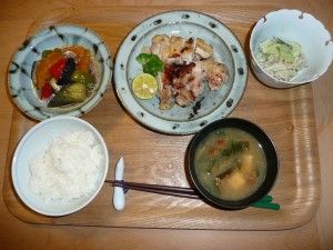 鳥の塩麹焼き、野菜の揚げびたし、きゅうり・紫玉葱・アボガドのサラダ、豆腐ときのことわかめの味噌汁 鳥の塩麹焼きは香ばしくてとても美味しかったです。毎日でも食べたいくらい。また、野菜サラダも紫玉葱が入っていて味に深みがでていて美味しく頂ました。
