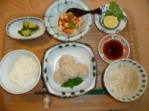 餅米しゅうまい、中華風きゅうり、タイ風そうめん、揚げ豆腐のキムチ和え パクチいりのそうめんはベトナムのフォーのようなそうめんで今回初登場でした。私はフォーが大好きなので大満足でした。しゅうまいはるさめ入りでした。