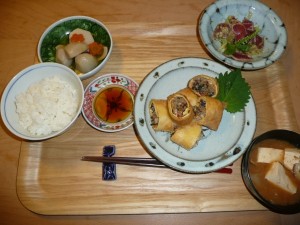 春巻き、マグロとアボガドのサラダ、小芋の葛煮、豆腐・しいたけ・大根の味噌汁 春巻きがサクサクパリパリしてとても美味しかったです。今回で二回目ですが本当に美味しかった。皆さんにも大好評でした。サラダも新鮮な組み合わせで楽しく食べさせて頂きました