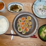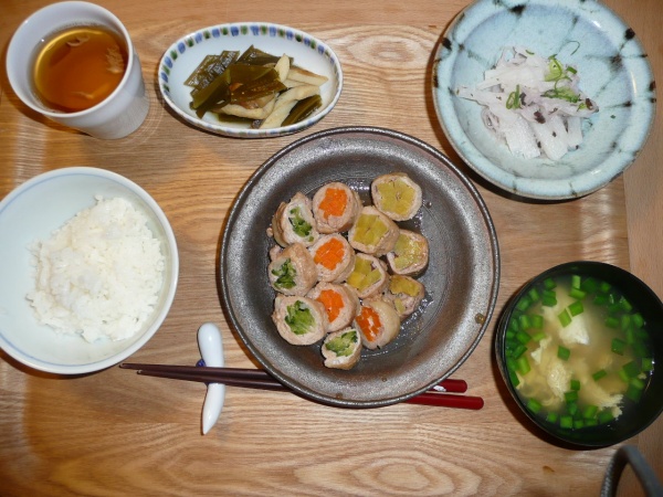 野菜の豚ロール(ゴーヤ・人参・さつまいも)、山芋と大根の梅風味サラダ、茎ワカメとちくわの含め煮、ニラ玉のお吸い物