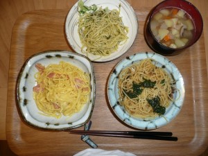 スパゲッティーのバイキング(カルボナーラ・ジェノベーゼ・オイルサーデンのにんにく醤油風味)、オクラときゅうりのサラダ、