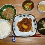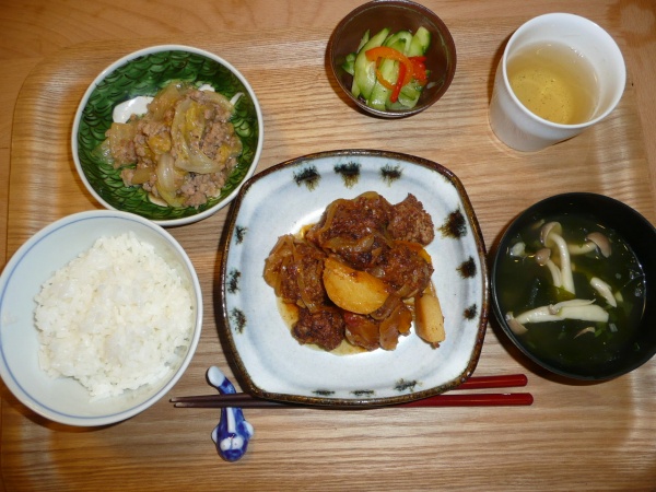 肉団子のトマト煮、白菜とミンチの味噌煮、きゅうりの甘酢和え、ワカメときのこのお吸い物 私の好きなミンチの肉団子のトマト煮の味が新鮮でとても美味しかったです。きゅうりもさっぱりして口当たりが良かったです。味噌煮も白菜とミンチに良く合っていました。