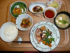 はまちの塩麹焼き、小松菜の甘味噌炒め、たこの入った酢の物、豆腐と玉葱のお味噌汁 今日の味噌汁も美味しかったです。この時期本当に味噌汁が美味しい。酢の物もみょうがが入っていて微妙な味が楽しめました。