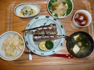 秋刀魚の塩焼き、ツナと白菜の煮物、大根とわけぎのぬた、ワカメと豆腐とおくらと大根のお吸い物、四方竹と揚げのご飯