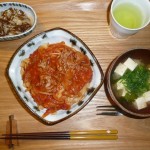 牛肉とトマトソース煮フェトチーネ、もずくとキャベツの梅煮和え、豆腐とワカメのお味噌汁 フェトチーネがもちもちとしていてスパゲティーとはまた違った感じで美味しかったです。少し寒くなりました。お味噌汁の美味しい時期ですね。