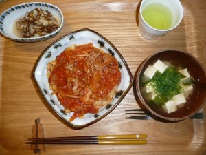 牛肉とトマトソース煮フェトチーネ、もずくとキャベツの梅煮和え、豆腐とワカメのお味噌汁 フェトチーネがもちもちとしていてスパゲティーとはまた違った感じで美味しかったです。少し寒くなりました。お味噌汁の美味しい時期ですね。