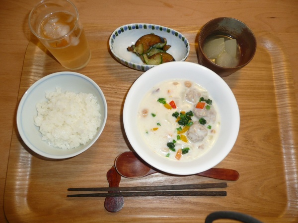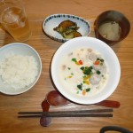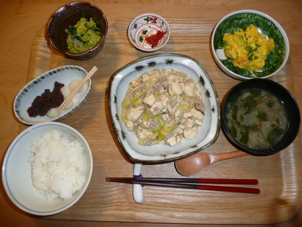 マーボー豆腐四方竹入り、かぼちゃサラダ、白菜とほうれん草の胡麻和え、玉葱ともずくとワカメのお味噌汁 四方竹の歯ざわりがよくて美味しいマーボー豆腐でした。お味噌汁にもずくも良く合います。美味しかったです。