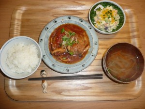 豆腐ハンバーグ、ポテトサラダ、玉葱と人参とパセリのチキンスープ ハンバーグは豆腐と豆乳が入っていてとてもしなやかなお味でした。
