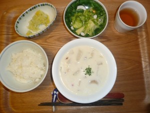 鳥のホワイトシチュー、りんごときゅうりとレタスのサラダ、白菜の漬物塩ポンズいり シチューは体が暖まりとても美味しかったです。漬物には珍しく塩ポンズがかけられていてとてもいいお味になっていました。