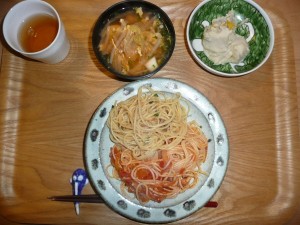 二種のスパゲティー、サンラータンスープ、里芋のとも和え 二種とはトマトソースとオイルサーディンのスパゲティーでした。オイルサーディンはいつも人気ですぐ無くなりました。スープはいつもながら甘酸っぱくてタイの香りがしました。エスニックスープです。お年を召した方達はスパゲティーの代わりにおうどんでした。