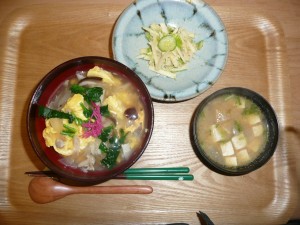 天津飯、りんごのサラダ、根菜のお味噌汁 天津飯は玉子がふんわりとして適度なとろみもありとても美味しかったです。