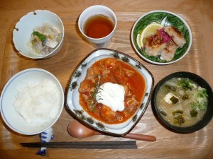 鶏肉のトマトソース煮塩ヨーグルト添え、あじのマリネ、レンコン餅、大根と豆腐とワカメとじゃがいもと玉葱のお味噌汁 鶏肉のヨーグルトがトマトのツンとした味を抑えてまろやかさ出していて美味しかったです。レンコン大好きの私はレンコン餅が非常に美味しかったです。サクサク感がたまりません。