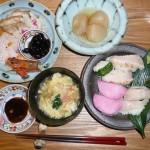 てまり寿司(鯛、鰤のあぶり、赤かぶ)、かぶの煮物、海老の旨煮、菊花かぶ、鶏肉の照り焼き、玉子とおふのお吸い物 今晩はお正月らしくご馳走でした。鰤のあぶりの握りがとても美味しかったです。菊花かぶも思いっきり頂きました。