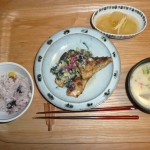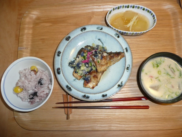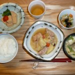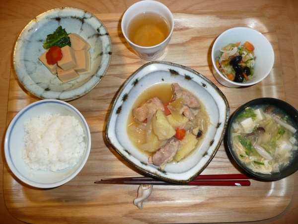 鶏肉の肉じゃが、五色ナマス、高野豆腐の煮物、かきたま汁(豆腐、キノコ、玉子) 五色ナマスが色とりどりで美しくまたいろんな味がして凄く美味しかったです。鶏肉のにくじゃがもなかなかあっさりしていいお味でした。