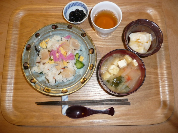 バラ寿司、豆乳ゴマ豆腐、黒豆、揚げと大根とワカメと人参のお味噌汁 お味噌汁のお揚げさんがおいしくておかわりしてしまいました。バラ寿司もおかわりしました。ゴマ豆腐はあっさりして美味しかったです。