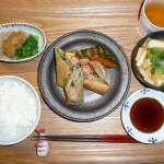 帆立の春巻きかぼちゃとれんこんとサツマイモ添え、もやしと菜花のゆず味噌、豆腐と揚げのお味噌汁 春巻きはポン酢とからし醤油で食べてみましたが、からし醤油の方が美味しかったです。れんこんの素揚げも春巻きも美味でした。