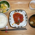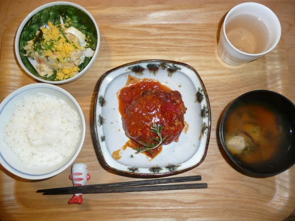 豆腐ハンバーグ、ポテトサラダ。しいたけと里芋とワカメのお味噌汁 お味噌汁のだしが良く出ていてとびっきり美味しかったです。いつもお味噌汁は美味しいのですが、今日は特別です。ハンバーグはやわらかく食べやすかったです。ポテトサラダも私の好きな玉葱が入っていました。