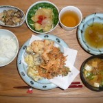 天ぷら(さつまいも、しいたけ、海老、人参のかき揚げ)、じゃがいもの煮っころがし、豆腐ときのこの和え物、豆腐と玉葱のお味噌汁 天ぷらはいつものように揚げたてを頂くので凄く美味しかったです。人参のかき揚げはなかなかのものです。今日は豆腐ずくしでした。