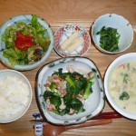 ターサイとキノコと豚肉の炒め物、レタスとトマトの野菜サラダ、ほうれん草の胡麻和え、クリームチャウダー 大根の漬物 クリームチャウダーの味付けが凄く上手で美味しかったです。おかわりしたいくらいでした。ターサイも噛み応えがありもりもりと頂きました。今日は野菜が一杯で嬉しい献立でした。生野菜も新鮮でした。