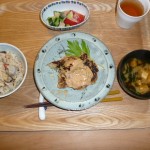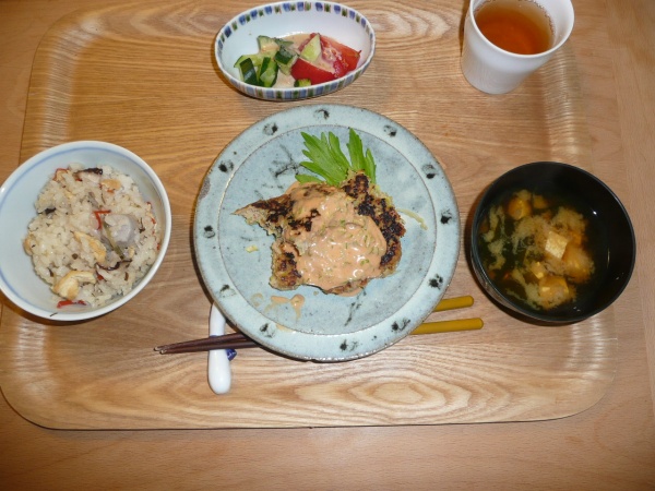 キャベツハンバーグセロリーソースっがけ、トマトときゅうりのサラダ、豆腐とワカメの味噌汁、炊き込みご飯 ハンバーグのキャベツの歯応えが何とも言えず美味しかったです。一瞬お好み焼きという感じに見えました。また、セロリーソースがいい味出していました。