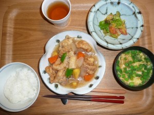 酢鶏、トマトときゅうりとレタスの野菜サラダ、ニラ玉豆腐のお味噌汁 酢鶏は沢山お肉が入っていて美味しかったです。私はニラが大好きなのでニラ玉のお味噌汁はとても嬉しかったです。