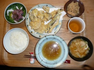 天ぷら(れんこん、いわし、さつまいも、しいたけ、のり)、揚げと切り干し大根の煮物、もずくと赤かぶの酢の物、小芋とキャベツのお味噌汁 天ぷらが揚げたてでどれもこれも美味しかったです。特に私はれんこんが大好きなのでおかわりを頂きました。久しぶりの切り干し大根も美味しかったです。おふくろの味です。