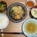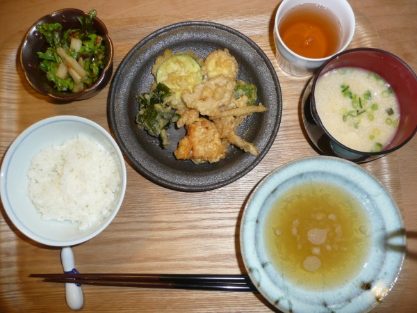 天ぷら(なす、さつまいも、ピーマン、ごぼう、れんこん、かぼちゃ、ワカメ) 豆乳汁豆腐入り、レタスと山芋のサラダ 今回は野菜ばかりの天ぷらでしたが、揚げたてを頂き美味しかったです。私はやはりなすとれんこんが好きです。この頃ご飯は少しのこし気味です。ダイエットです。