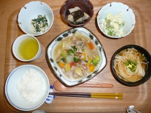 八宝菜、アボガドとベーコンとポテトのサラダ、里芋の煮物、半田素麺のお味噌汁 八宝菜がお野菜たっぷりで野菜で体が洗われる感じでした。サラダはアボガドもベーコンも凄く美味しかったです。お味噌汁も麺入りで体が温まりました。
