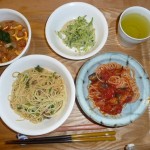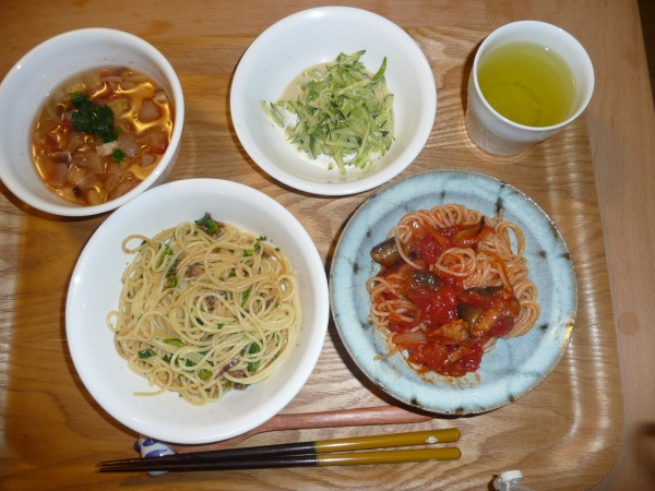スパゲティー二種(オイルサーディン、トマトとナスとベーコン)、生姜入りミネストローネ、レタスときゅうりの胡麻ドレ オイルサーディンは私のリクエストでした。思いっきり昼からオイルサーディンのスパゲティーを食べつくしました。本当に美味しかったです。何度食べても飽きません。トマトもナスとベーッコンが美味しかったです。ミネストローネも具沢山で生姜が体を温めました。お昼からイタリアンメニューで豪華でした。