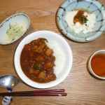 カレー、おぼろ豆腐、大根ときゅうりのサラダ 今日のカレーの野菜は玉葱以外全部油で揚げられていました。野菜に腰ができしっかりしてとても美味しかったです。おかわりしました。西梅田のミンガスという古いカレー屋さんも昔から野菜は全部揚げています。それがまた凄く美味しいのです。評判のお店です。