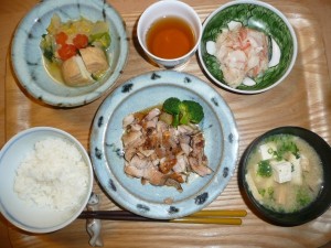 鶏肉の塩麹焼き、帆立のナマス、お豆腐揚げと白菜と青梗菜の煮物、豆腐と揚げのお味噌汁 塩麹焼きが味がよくしみ込んでいてとても美味しかったです。お豆腐揚げもやわらかく煮てありました。野菜とよく合います。