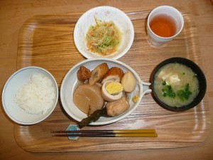 おでん(玉子、大根、じゃがいも、ごぼてん、ちくわ、手羽先、コンブ、がんも)、ナマス、豆腐と玉葱のお味噌汁 大根も手羽先もやわらかくて味がよくしみこんでいて凄く美味しく頂きました。私はおでんの玉子も好きです。お昼から沢山頂きました。
