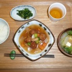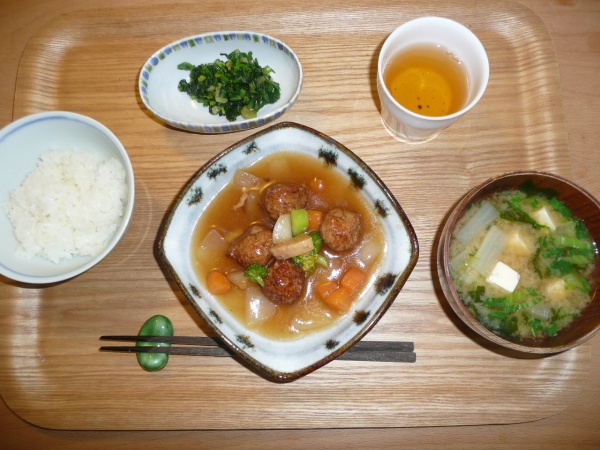 肉団子の酢豚、ほうれん草のポン酢和え、豆腐と大根とワカメと白菜のお味噌汁 酢豚は高齢者施設なので豚ミンチが使われていましたが、とても美味しかったです。たれも程よい甘さで、全部頂きました。時々思いっきりお肉が食べたくなりますが、ここではあまり望んではいけない事なので、自分で作ることにします。例えば焼肉とか、ステーキとか。