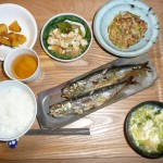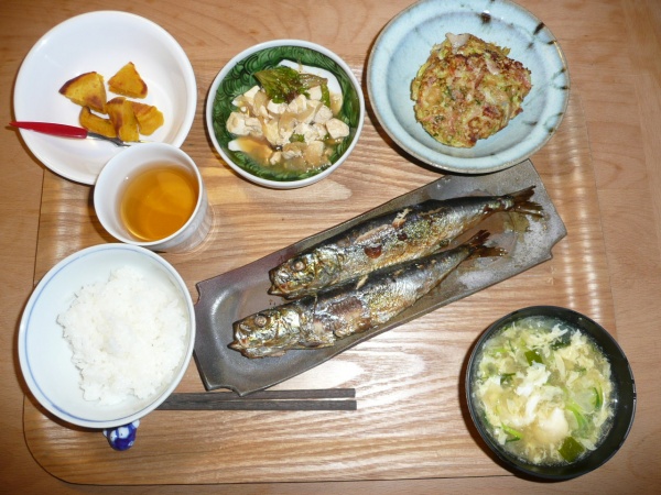 いわしの塩焼き、山芋とキャベツとレンコンのおやき、豆腐と玉葱のサラダ、長ネギと玉葱と玉子のお吸い物 いわし二匹丸まるでしたが、久しぶりでとても美味しかったです。おやきはレンコンがサクサクしてまるでお好み焼きのようでおたふくソースをかけて食べました。サラダは玉葱と豆腐がよくあっていてとても美味しかったです。長ネギの沢山入ったお吸い物も美味しく頂きました。