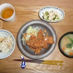 チキンカツ、豆腐とレタスの玉葱のサラダ、ジャガイモと人参と玉葱と春菊のお味噌汁 豆ご飯 お昼からご馳走でした。カツはいつもながら揚げたでカリカリと美味しく頂きました。豆腐サラダも玉葱が入っていて美味しかったです。