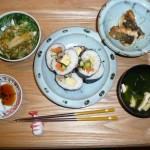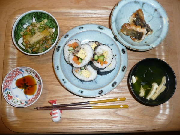 巻き寿司、ねばねばサラダ、穴子のあまから焼き、わかめと揚げのお吸い物 サラダは納豆、おくら、やまいも、メカブでした。本当にねばねばでいかにも体に良さそうでした。穴子は久しぶりで美味しく頂きました。時にはお寿司を食べるのもいいですね。