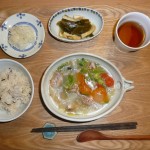 和風八宝菜、茎ワカメと揚げの梅煮、大根のお漬物、里芋と生姜と昆布のご飯 梅煮の酸っぱさががとても新鮮で美味しかったです。八宝菜もあっさりしていて食べやすかったです。ご飯も生姜入りで美味しく頂きました。