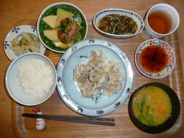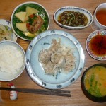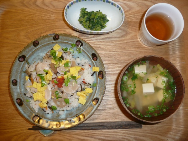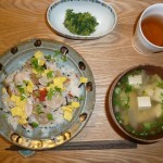 バラ寿司、春菊の胡麻和え、豆腐と大根と里芋と白菜と生姜とえのきのお澄まし 今日の材料は全部で18種類だそうです。バラ寿司もトッピングが帆立と玉子と梅でした。具材は昆布やレンコンなどが入っていました。お澄ましも具沢山で美味しかったです。