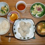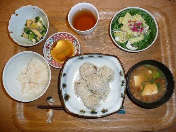 シュウマイ、山芋とアボガドのサラダ、わけぎのぬた、豆腐となめたけのお味噌汁 サラダがサクサクとして歯触りもよくて美味しかったです。お昼スパゲティーを食べ過ぎて夕方になってもお腹がすかないまま夕食に突入しました。ですから、あまり食欲がありませんでしたが、ご飯以外全部食べました。因みに今日のご飯は生姜入りご飯でした。体にいいですね。