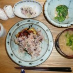レンコンとねぎとえびのチリソース、大根と手羽先の煮物、ポテトサラダ、中華風スープ チリソースはしもねたねぎが甘くまたれんこんも美味しかったです。煮物は大根がこの上なく柔らかく煮られているし手羽先もコラーゲンたっぷりという感じでした。スープはたけのこと白菜とまいたけと玉子入りで具沢山でした。