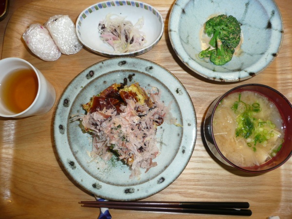 お好み焼き、大根の梅紫蘇和え、ブロッコリーのゴマドレ和え、大根と玉葱と揚げとじゃがいものお味噌汁 おにぎり 目の前で焼いて出されたお好み焼きはふわふわシャキシャキでとても美味しかったです。ついつい食べ過ぎてしまいます。大根やブロッコリーやお野菜たっぷりのお味噌汁が体に嬉しいです。