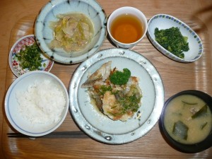 たらのムニエル薬味ソースがけ、春菊の胡麻和え、ツナと白菜の煮物、みずなと大根の漬物、しめじとワカメと小芋のお味噌汁 ムニエルの薬味が美味しくてムニエル美味しく頂きました。ツナと白菜も白菜がとろけるようにやわらかくなっていて食べやすかったです。毎日お野菜一杯で嬉しい!!