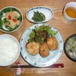 天ぷら(なす、さつまいも、ピーマン、ごぼう、れんこん、かぼちゃ、ワカメ) 豆乳汁豆腐入り、レタスと山芋のサラダ 今回は野菜ばかりの天ぷらでしたが、揚げたてを頂き美味しかったです。私はやはりなすとれんこんが好きです。この頃ご飯は少しのこし気味です。ダイエットです。