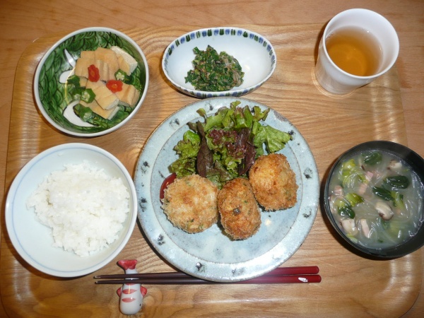 里芋と鶏ミンチのコロッケ、菊菜と茶エノキの胡麻和え、薄揚げの含め煮、ターサイとハルサメとベーコンの中華スープ コロッケの中には小松菜も入っていてミンチは生姜で味付けされていました。どちらかというと和風コロッケだと思います。美味しかったです。ケチャップで頂きました。スープがいい味でベーコンもハルサメもターサイも美味しかったです。この組み合わせはグーだと思います。ターサイはいつ食べても美味しいです。