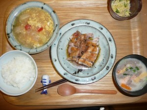 鶏肉の照り焼き、かぶらと白菜のトロトロ玉子煮、キャベツの酢味噌和え、粕汁 粕汁の中には大根やコンニャクや鮭が入っていてそれはそれは美味しかったです。豆乳も入っているそうです。冬は粕汁ですね。かぶらはトロトロになっていましたがそれはそれで美味しく頂きました。鶏肉は少々固めでしたが噛み応えがありました。