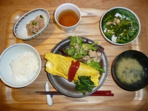 オムレツレタスほうれん草添え、れんこんのきんぴら、つぼみなと揚げの煮浸し、ワカメとエノキのお味噌汁 オムレツの中はミンチ肉と玉葱でケチャップをつけて食べました。この味が母の味でとても懐かしかったです。レタスもほうれん草も有機栽培の野菜でムシャムシャと美味しく頂きました。つぼみなも少し苦味がありましたが美味しかったです。